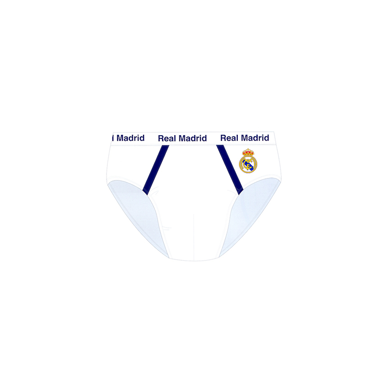 Chaussons Real Madrid. Blanc et bleu. Logo brodé. Velouté. Semelle anti-glisse. De la taille 30 à 47.